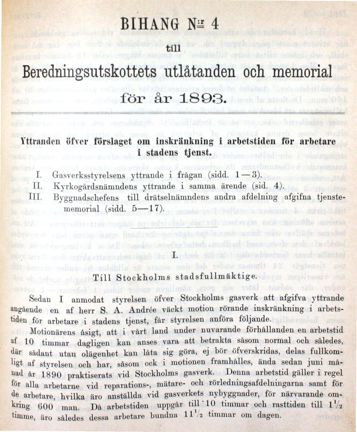 Hösten 1892 inkom Salomon August Andrée med en motion om sänkt arbetstid för stadens arbetare. Med anledning av detta startade beredningsutskottet en stor utredning av hälsotilståndet och arbetstiden i stadens olika verksamheter.