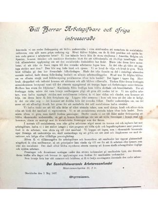 Upprop från Det samhällsbevarande arbetaresamfundet, tryckt i Stockholm 1896. Huvudbudskapet i uppropet: socialism är hemskt, riktigt hemskt till och med.