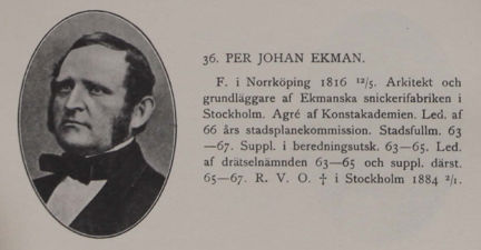 Arkitekt och grundläggare av Ekmanska snickerifabriken i Stockholm. Agré av Konstakademien. Stadsfullmäktig 1863-1867 och suppleant i beredningsutskottet 1863-1865.