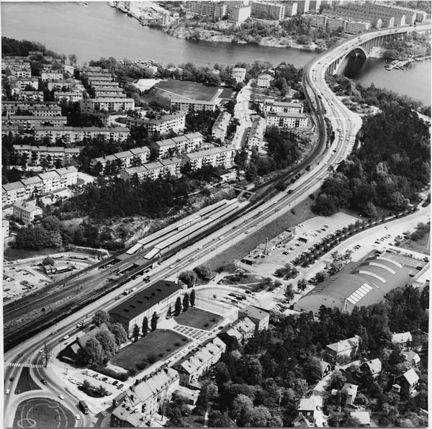 Tunnelbanestation Alvik i centrum. Tranebergsbron i bakgrunden. SALK-hallen den stora byggnaden till höger.