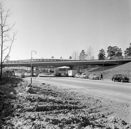 Tunnelbanebron över Farstavägen. I bakgrunden den tillfälliga stationen för tunnelbanan samt en buss på linje 185
