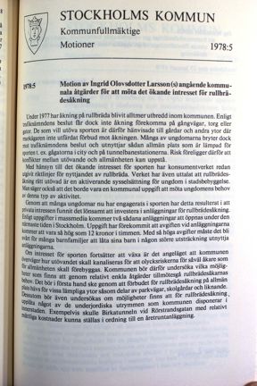 Socialdemokraten Ingrid Olovsdotter Larsson motionerar om åtgärder för att möta intresset för rullbrädesåkning: "Under 1977 har åkning på rullbräda blivit alltmer utbredd inom kommunen."