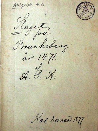 Historikern Alfred Gustaf Ahlqvist (1838-1881) berättar om slaget vid Brunkeberg. Texten i sig är ett särtryck ur tidskriften Nornan från 1877.