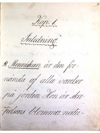 1839 var Emelie Augusta Noréen student på Wallinska flickskolan i Gamla stan. Intill går det att ta del av ett utdrag från en av fröken Noréens övningar i s.k. skönskrivning. Ämnet för övningen, som primärt var till för att träna elevens skrivstil, var "anthropologi".
