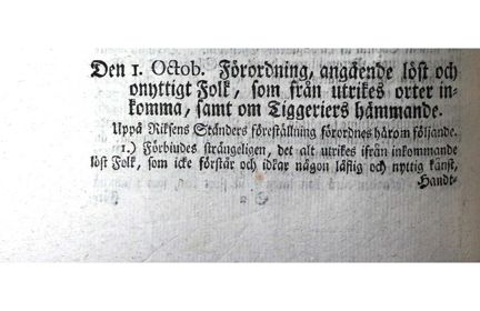 ”Förordning, angående löst och onyttigt folk, som från utrikes orter inkomma, samt om tiggeriers hämmande.
