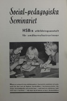 Socialpedagogiska seminariet startades 1936 av bl.a. Alva Myrdal som också var skolans rektor. Här utbildades barnpedagoger till HSB:s lekstugor och s.k. storbarnkammare i kollektivhus. I utbildningen ingick bl.a. psykologi, pedagogik, hygien och medicinsk barnavård. Genom väl utbildad personal skulle barnen få både en pedagogiskt bra uppfostran och tas om hand fysisk på bästa sätt.