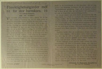 På baksidan av polisrapporten har någon klistrat fast en pamflett som ska ha delats ut under mötet. Pamfletten är rubricerad Försiktighetsåtgärder mot för stor barnaskara. Till arbetarklassens män och kvinnor!. I den finns en rad handfasta tips om hur man kan minska chanserna att bli med barn när man har sex. Bland tipsen märks det med moderna ögon helt felaktiga rådet: