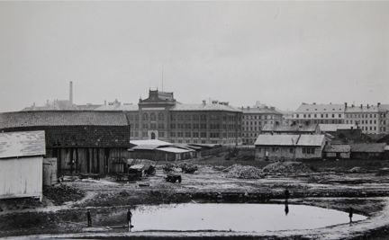Resterna av insjön Stora Träsket år 1900. Gatan som syns i bakgrunden är Roslagsgatan och byggnaden centralt i bilden är skolan Norra Real.