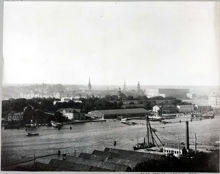 Utsikt mot Skeppsholmen från Djurgården från minareterna på Industrihallen, utställningen 1897