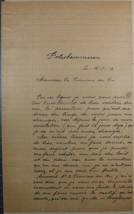 Den 16 juli 1912 skriver F. Bosch Vilá det här brevet till stadsfiskalen. Han har då suttit häktad i 16 dagar och vill nu ha linne och tillgång till sina pengar så att han kan köpa mer näringsrik mat än den som ges i fängelset. Dessutom vill han veta varför han är arresterad.
