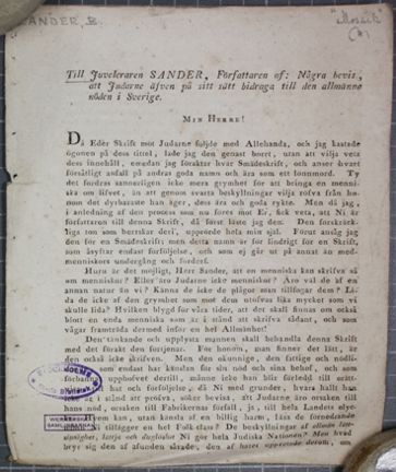 En juvelerare Sander hade 1809 skrivit nedsättande om judarna som folkgrupp. Sanders text bifogades i Dagligt Allehanda och väckte stark reaktion.