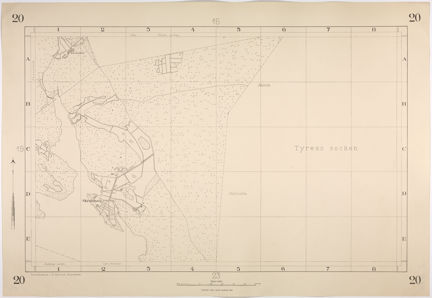 Översiktskarta i 23 blad över Brännkyrka, blad 20. Daterad till 1923. Tryckt på Generalstabens Litografiska Anstalt i Stockholm. Skala 1:4000. Originalets storlek 100 x 70 cm.
