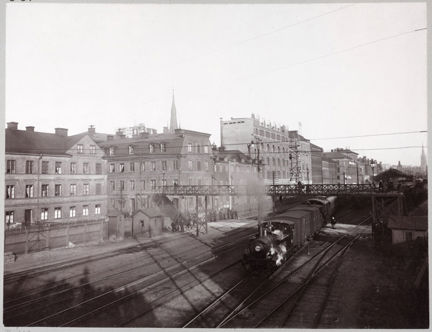 Spårområde med ånglok. Vy söderut från Gamla Kungsholmsbrogatan