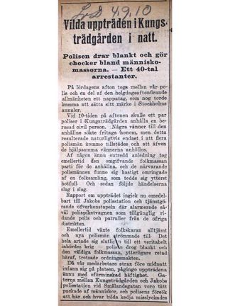 Artikel från Svenska Dagbladet om ett upplopp i Kungsträdgården natten mellan den 3 och 4 september 1910. Flera samtida journalistiska texter om händelsen hittas via länkarna till höger.