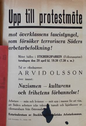 Pamflett som uppmanar till protestmöte mot: ”överklassens fascistyngel, som försöker terrorisera Söders arbetarbefolkning!”