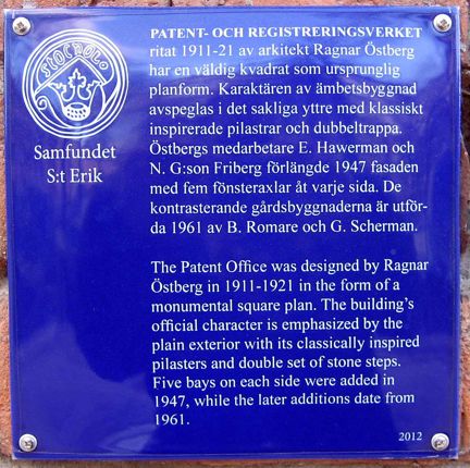 The Patent Office was designed by Ragnar Östberg in 1911-1921 in the form of a monumental square plan. The building’s official character is emphasized by the plain exterior with its classically inspired pilasters and double set of stone steps. Five bays on each side were added in 1947, while the later additions date from 1961.