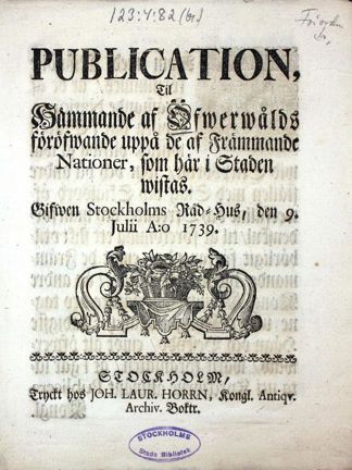 ”Såsom med Missnöije förnimmes / at de af Främande Nationer, hwilka här i Staden wistas / blifwa så wäl wid Skiepsbron / som och på andre ställen med Slag och Skiälsord öfwerfallne och Ofredade / och man fördenskul / til at förekomma ett slikt otilbörligit förfarande / emot de Främmande / hwilka icke mindre / än andre Kongl. Maij:ts Undersåtare / äro tagne under Kongl. Maij:ts Rådigste Hägn och Beskydd / emot alt öfwerwåld / warit föranlåten / at i går låta uti Kyrckiorne allmänt Publicera Kongl. Maij:ts Rådige Förbud emot öfwerwåld på Främmande / gifwit Stockholm i Råd-Cammaren den 18. Augusti Åhr 1735; Altså har hög-Wälborne herr Baron och Öfwerståthållaren samt Magistraten för nödigt funnit härmed än ytterligare at låta allmänneligen kundgiöra / det ingen må fördrista sig / at på något sätt Förolämpa någon här warande Främmande af hwad Nation eller Wilkor den wara må / mindre med Slag eller Skiälsord angripa wid ett swårt och exemplart straff tilgiörandes / warandes til de Wachthafwande de Ordres stälte / at de wid slike tilfällen och derest de Främmande skulle av någon enskylt eller genom sammangaddningar af flere warda angripne / skola de i så måtto Broklige strart uti Arrest inmana / på det då må ställas under laga Förhör och sedan undergå det förtiente straff / som på sådane emot den allmänne säkerheten och Högst-Bemälte Hans Kongl. Maijt:s Nådigste Förbud stridande förbrytelse oundwikeligen följa bör. Stockholms Rådhus / den 9 Julii Anno 1739."