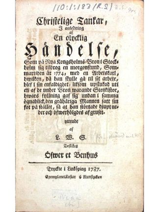 En religiös text - ”Christelige Tankar” – om en arbetskarl som i sin ”enfaldighet” råkat ut för en olycka med dödlig utgång på ”Nya Kongsholms-Bron”. Från 1787. ”Nya Kongsholms-Bron” heter idag Stadshusbron.