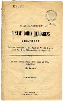 Torsdagen den 17 innevarande maj kl. 6 fm meddelade i huset n:r 22 vid Vattenledningsvägen, uppgång 6, 1 trappa upp i Tellusborg boende snickaren John Alfred Andersson per telefon till andra polisdistriktets station, att han kort därförut anträffat liket af en för honom okänd kvinna vara liggande i vattnet uti den s.k. Svandammen i Tellusborg, och att Andersson, med tillhjälp af en annan person, dragit upp liket på land samt, emedan kvinnan syntes hafva legat i vattnet endast en kort stund, genom konstgjord andning sökt återkalla henne till lif, hvilket emellertid icke lyckats.