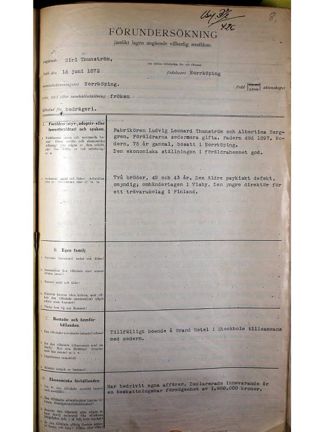 Förundersökning av den bedrägerianklagade Siri Thunströms ”karaktär och personliga förhållanden”.