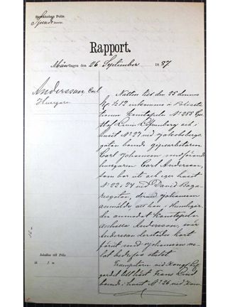 Natten till den 25 dennes kl 1/2 12 inkommo i Polisstationen konstapeln No 255 Gustaf Levin Löfvenborg och i huset No 27 vid Jakobsbergsgatan boende gipsarbetaren Carl Johansson medförande husegaren Carl Andersson, som bor uti och eger huset No 22 o 24 vid David Bagarsgatan, dervid Johansson anmälde, att han i Humlegården anmodat konstapeln anhålla Andersson, enär Andersson derstädes kort förut med Johansson velat bedriva otukt.