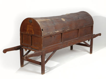Sjukbår på fyra fötter av trä. Välvd överdel av textil. Till båren hör madrass, en kudde och bärselar. "SP" skrivet inuti och stämplat på bärselarna. Har tillhört Maria polisstation.