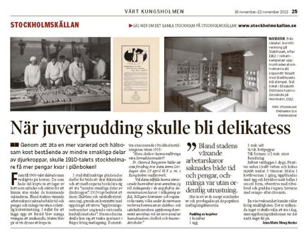 Artikel om hushållning i kristid (1910-tal). I artikeln förekommer bland annat ett recept på juverpudding. Publicerad i Vi på Kungsholmen (Direktpress) i november 2013.