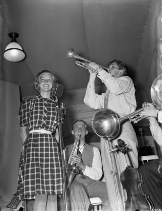 Sångerska Alice Babs sjunger till orkestern Benny´s Tiger Boys.