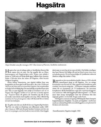 Texten kommer från en informationstavla som var placerad på Hagsätras tunnelbanestation under kulturhuvudstadsåret 1998. Den togs fram i projektet "Stockholms spår" i samarbete med Stockholms stadsmuseum, SL (Storstockholms lokaltrafik) och Kulturhuvudstadsåret Stockholm 98.