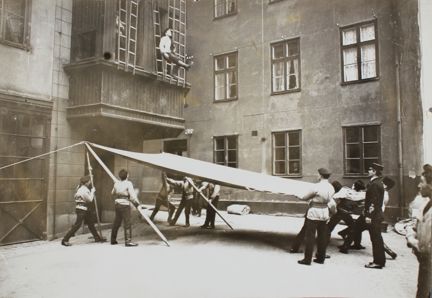 Brandsoldater vid Johannes brandstation övar på hopp från hus. Mannen i luften är 1:e brandsergeant Svensson.