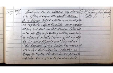 Hörd å stationen, erkände Nerman riktigheten av konstapelns rapport. Dock förnekade Nerman, att hans beteende och yttrande väckt allmänt förargelse. Nerman berättade härom följande: Han hade varit stående å förenämnda plats för att invänta Svenska Brigadens ankomst. Då tåget kommit passerande, hade Nerman sträckt ut sin högra hand mot tåget och samtidigt ropat: ”Fy, mördare.” Nerman hade hört, att en man, som varit stående i närheten uttalat sin förargelse över Nermans yttrande. Nerman ansåg, att detta icke kunde hanföras till allmän förargelse, emedan ingen annan av de till ett antal av flera hundra personer, som var stående därstädes, visat sig förargade däröver. Såsom vittne har å stationens antecknats ingeniören Erik /…/ Öhlund, som är boende i huset n:r 8 Borgmästargatan 4 trappor upp. Efter det Nerman blivit hörd, fick han stationen. Han är boende i huset n:r 30 Biblioteksgatan 3 tr. upp."