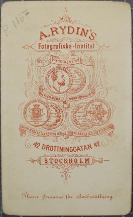 Bilden är tagen i A Rydins ateljé på Drottninggatan 42 i före detta fastigheten Skansen 5, det vill säga där trapporna ner till Sergels torg från Drottninggatan finns idag.