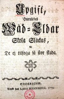 "Til förekommande af wådeliga händelser, är wäl genom tid efter annan utkomne Författningar förbudit, at owarsamt med Eld umgå och at i synnerhet röka tobak på gatorne och i sådane hus och rum, där Eld lätteligen kan antändas; dock som thesse Författningar ej sällan öfwerträdas, hwartil kommer, at enligt Kongl. Directionens öfwer the Regale Brännerierne i Riket till Öfwer-Ståthållare-Embetet afgifne skrifteliga berättelse, bland Betieningen wid the Regale Brännerierne här i Staden och ther warande Tjenstfolk, thet sjelfswåld sig skal inritat, at the esomoftast med antända och rökande tobaks-pipor gå inom Bränhusen eller Bränhusgården; Altså och på thet the olyckor i tid måge afböjas, hwilka under tobaks rökande af Elds spillning lätteligen kunna upkomma, har Öfwer-Ståthållare-Embetet härigenom allmänneligen welat kungöra, at ej någon i foder- och slögde-hus, windar, wed- och kohl, stall-. och wagns-hus samt inom Bränhusen och Bränhusgårdarne, eller annorstädes, samt på gatorne här i Staden, i synnerhet på och under Broarne, i Hamnarne, i Slagtarehusen och Fiskargångarne, i Stadens Wågar och Mätarehus, på Rännarebanan wid Hötorget och på Trapporne som löpa up ifrån Stadsgården til Södermalm och St. Catharinae sidan, och the flere ställe, ther eld lätteligen kan antändas, må understår sig at röka tobak, eller ther gömma pipa och tobak, eller ock gå med bart ljus utan lykta, eller annorlös och bar Eld, eller eljest wårdlöst handtera Elden, och at then, som häremot bryter, skal, åntå at ingen skada sker, wara förfallen til 10 Dal. S:mts pligt, angifwarens, eller beklagarens ensak, samt thesutom om thet är Tienste- eller Arbets-Hion, sitta en Söndag i Stocken: men at i fall någor Tienste- eller Arbets-Hion kommer andra gångne igen, skal han utom the angifwaren här ofwanföre tilerkände 10 Dal. S:mt, straffas med fängelse wid watten och bröd, eller med spö och rislitande efter omständigheterne.