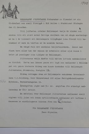 Sällskapet Jultomtarne, en förening som arbetade med välgörenhet för fattiga barn, jubileumsfirade i Blå Hallen i Stadshuset, den 21 december 1930. Här i dokumentet kan du läsa om deras verksamhet.