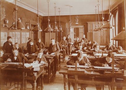 Interiörsbild ifrån Norra Reals ritsal, förmodligen från 1910-talet. Ämnet "teckning" stod på schemat redan då sagda skola öppnade upp sina portar 1890.