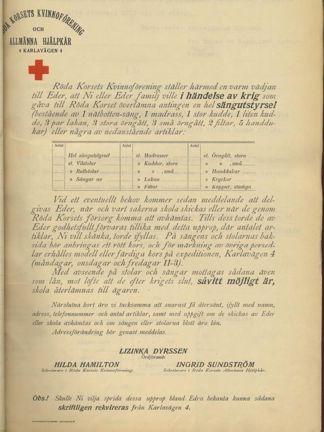 Upprop från Röda Korsets Kvinnoförening till alla som önskade skänka gåvor i händelse av krig: "Röda Korsets Kvinnoförening ställer härmed en varm vädjan till Eder, att Ni eller Eder familj ville i händelse av krig som gåva till Röda Korset överlämna antingen hel sängutstyrsel..."