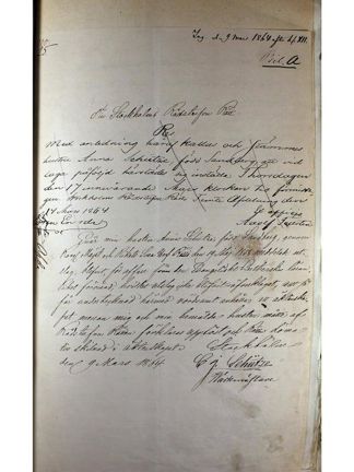 ”Enär min hustru Anna Schütze, född Sandberg, genom Kungl Majts Och Rikets Svea Hov Rätts den 19 Maj 1858 meddelade utslag, blifvit, för affall från den Evangeliskt Lutherska läran, Riket förvisad, hvilket utslag icke blifvit öfverklagat, att så får undertecknad härmed vördsamt anhålla att äktenskapet mellan mig och min bemälda hustru måste af Rådstufan Rätten förklaras upplöst och Rätten döma till skilnad i äktenskapet. Stockholm den 9 Mars 1864. G J. Schütze. Wärkmästare”