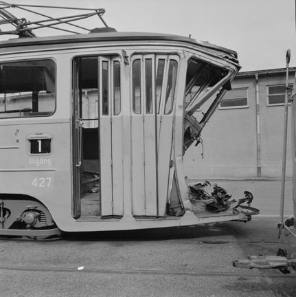8 juni 1959. Bromsarna på ett spårvagnståg på linje 7 slutade fungera i Odengatsbacken, varpå det körde rakt in i en spårvagn, av typen mustang, som stod på hållplatsen vid Sveavägen.
