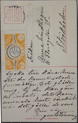 Det här vykortet fick barnavårdsinspektrisen Anna Lindhagen från Augusta Tonning 1911. Tonning gratulerar Lindhagen för att hon just blivit invald i Stockholms stadsfullmäktige. Vykortet är producerat som ett led i marknadsföringen för den internationella rösträttskongress som hölls i Stockholm samma år, den 6:e i ordningen som arrangerades av the International woman suffrage alliance.