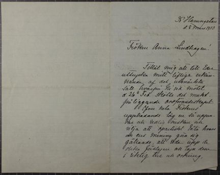Tillåt mig att till Eder uttrycka mitt lifliga erkännande af det utmärkta sätt hvarpå ni på mötet d. 26te Feb. skötte det maktpåliggande ordförandeskapet.