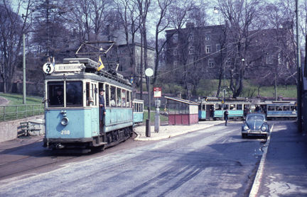 Spårvagnståg litt A11 nr 288 (M.A.N. 1922) med släpvagn (skymd) samt litt. C7 nr 1891 (Arlöf 1908). Därefter litt. A1 nr 92 (Råsunda 1926 med litt. B7 nr 573 (Atlas 1882). Historisk mtrl.