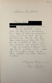 Härmed anmäles, att flickan Inez Alexandra Pettersson, född 17/2 1887 och boende hos sin moder, änkan Joh. Marg. Pettersson i baracken vid Bellevue, är i hög grad vanartig. Hon har upprepade gånger skolkat skolan, såväl härstädes som i Östermalms folkskola, där hon förut gått, hvarjämte hon under denna termin blifvit anmäld hos vederbörande polismyndighet för af henne begången stöld. Hon är dessutom lat och lögnaktig och visar i allmänhet ett dåligt uppförande, hvarför jag befarar, att hennes närvaro i skolan kan skadligt inverka på de öfriga barnen. Då hennes moder till följd av sitt arbete är borta från hemmet hela dagarne och flickan således helt och hållet lemnad utan tillsyn, vore i hög grad önskligt, att hon kunde blifva intagen å något barnhem.