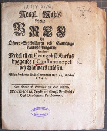 Oss hafwa Riksens Ständer så wäl wid Riksdagen År 1739. som ock wid nyss överståndne Riksdag under then 22. sidstledne Augusti i underdånighet förestält thet the inhämtat i hwad slätt och uselt tilstånd then Ewangeliske Församlingen i Constantinopel sig befinner; Och som det till GUDS Namns ära och många Siälars befrielse ifrån ewig wåda mycket bidraga skulle, at en Ewangelisk Kyrka therstädes upbygdes, hwarest Gudstiensten ordenteligen underhållas kan för them som dels til Församlingens förswar, dels ock til des skötande tiena, jemwäl och för Wåre Swenske och andra Nationer utaf Wår Protestantiska Lära, the ther årligen til en myckenhet för handel skul til Constantinopel anlända, eller och under et swårt slafweri äro bundne, och til theras Siäla-Wård intet understöd äga; Så hafwa Riksens Ständer i anseende thertil för en gång bewiljat til samma Christeliga wärks thesto mera befrämjande Twå Öre Silfwemynt af hwart Matlag, både på Landet och i Städerne öfwer hela Sweriges Rike, Hwar wid Präste-Ståndet af nit och ömhet för thenna angelägenhet sig på thet sättet förenat, at hwar Pastor för sig nästkommande År härtil förskjuter åtminstone Tolv Öre Silfwermynt; Giörandes sig Riksens Ständers thet säkra hopp, at en hwar lärer med gladt hierta thesse pennningar utgifwa, och efter råd och ämne något ytterligare efter egit behag härtil sammanskiuta. Wår Nådige wilje och Befalning är förthenskul at I, uti Edert Nådigst anförtrodde Län, dragen behörig försorg thet härtil särskilte Stamböcker eller längder måge uprättas; hwaruti Cronobetienterne, som thesse penningar på landet komma at upbära, uti ena columnen anteckna hwad som i följe af thenna bewilning erläggas, och uti then andre upskrifwa hwar och en, hwad han af Christelig gifmildhet och god wilja ther utöfwer härtil bidrager: kommandes thesse medelat stå under Wårt och Riksens Canszli Collegi disposition, med hwilket I härom hafwen at correspondera; emedan omsorgem om thesse medels indragande och ut remitterande til theras rätta behof bemälte Collegio är updragit. Theslikes och som Riksens Ständer hålla före, at hwar Kyrka i Riket til thetta Christeliga wärck kunde aflåta någon penning, neml. the mäst förmögna Twå och Tre daler, mindre förmögne En Daler, och minst förmögne Sexton öre, alt Silfwermynt; jemwäl och för godt funnit, at til usla slafwars understöd och utlösen, en Årlig collect i fyra År öfwer hela Sweriges Rike, äfwen ifrån de församlingar, som eljest för Collecter äro befriade nu utskrifwas måtte; Så hafwe Wi och låtit afgå Wåre Nådige ordres til samtelige confistorierne, at om thesse kyrko medeles och Collecters insamlande draga behörig försorg: hwilket Wi Eder äfwen til underdånig efterrättelse i Nåder tilkänna gifwa welat. Och wi befalle Eder Gud Alsmäktig Nådeligen. Stockholm i Råd-Cammaren then 12. Octobris 1741."