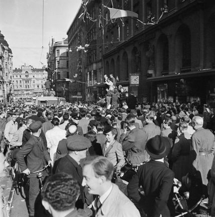 Fredsdagen den 7.e maj 1945 på Kungsgatan i Stockholm. Glada folkmassor längs gatan och från husfasadernas fönster kastar människor papper och girlanger.