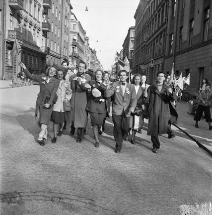 Fredsdagen den 7:e maj 1945. Glada och flaggviftande människor firar freden längs Kommendörsgatan.