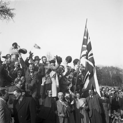 Fredsdagen den 7:e maj 1945. Glada viftande människor firar freden.