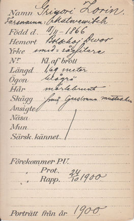 Den 23 november 1900 klev Grigori Zorin och fyra av hans sågfilarkollegor av båten i Stockholm. De togs direkt till förhör med polisen. Läs polisrapporten så får du veta mer om Zorin! I samband med förhöret tog polisen det här fotografiet. På baksidan av fotot finns följande information antecknad: