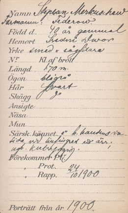 Den 23 november 1900 klev Stephan Merkuschew och fyra av hans sågfilarkollegor av båten i Stockholm. De togs direkt till förhör med polisen. Läs polisrapporten så får du veta mer om Merkuschew! I samband med förhöret tog polisen det här fotografiet. På baksidan av fotot finns följande information antecknad: