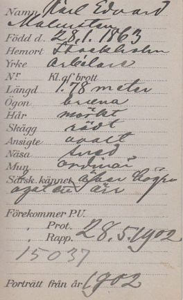 Det här fotografiet av Carl Edvard Malmsten togs i samband med att han blev gripen i maj 1902. Malmsten begick flera brott under årens lopp. 1904 attackerade han en hamnarbetare med kniv - läs om det i den här polisrapporten.