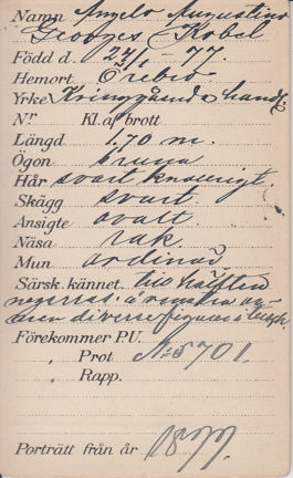 1899 varnades Angelo Augostino Georges-Kobel för lösdriveri. I samband med det togs det här polisfotografiet. På baksidan av kortet har polisen bland annat antecknat att Georges är kringgående handlande och "till hälften negerras". På vänstra armen har han "diverse figurer i tusch".